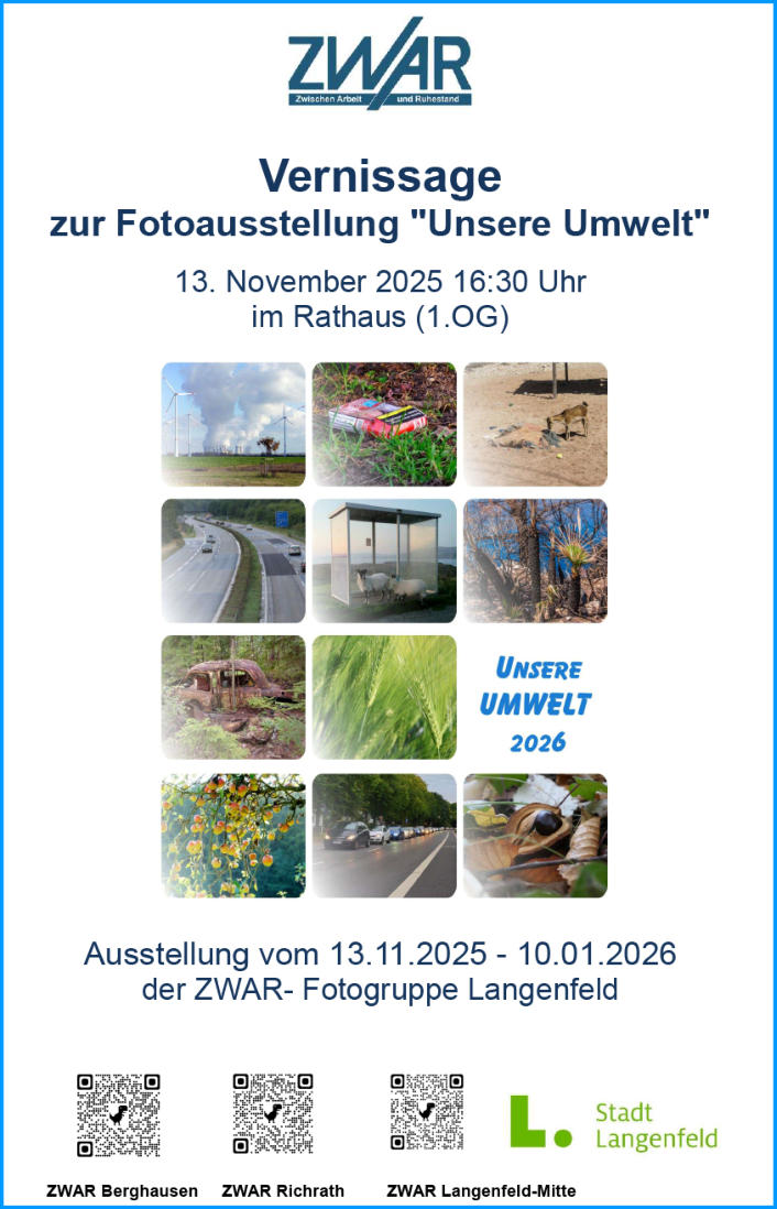 Die Fotointeressierten kommen aus mehreren ZWAR-Gruppen Langenfelds. Im monatlichen Fototreff werden neue Bilder besprochen, Techniktipps ausgetauscht und Fotoaufträge erteilt.Regelmäßige Aktivitäten•Individuelle Ausführung/ Besprechung vereinbarter Fotoaufträge•Bild des Monats •Gemeinsame Fotoexkursionen•Fotos zu Ausstellungsthemen z.B. "Verbindungen"•Organisation von Ausstellungen und DiashowsWir laden zum Mitmachen ein. Einfach vorbeikommen oder vorher Kontakt nehmen.Ansprechpartner:Wolfgang FreudenhammerTel: 02173 - 995336Mail: wolfgang.freudenhammer@gmx.de